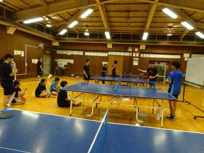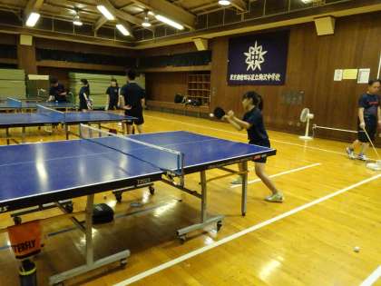 午後の格技室では卓球部が活動しています。明日の都大会に出場するメンバーだけでの練習です。都大会で勝つためにどう戦えばいいか、コーチから伝授してもらっていました。(遠藤)