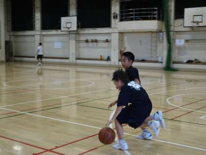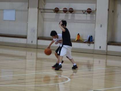 午後の体育館では男子バスケットボール部が活動しています。1対1の練習をしていました。ディフェンスはオフェンスの正面に入って止めましょう。(遠藤)