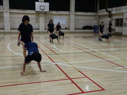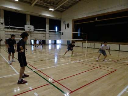 体育館ではバレーボール部が活動中です。男女とも3年生が引退し、1,2年生だけの新チームの活動が始まりました。フットワークや基礎トレーニングで体作りからですね。がんばりましょう。(遠藤)