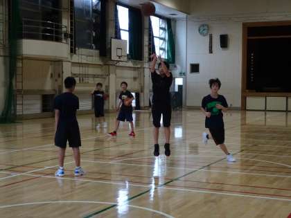 午後の体育館では男子バスケットボール部が活動していました。速攻の練習やセットオフェンスの練習をしていました。(遠藤)