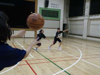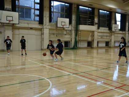 15時から女子バスケットボール部が体育館で活動中です。45度からの1対1です。オフェンスは動きに緩急をつけてディフェンスをずらしてパスをもらいましょう。(遠藤)
