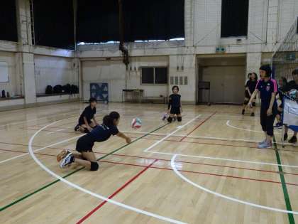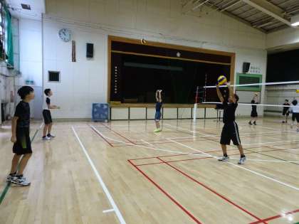 体育館ではバレーボール部が活動しています。男子はオーバーハンドパスの練習をしていました。女子はレシーブ練習をしていました。(遠藤)