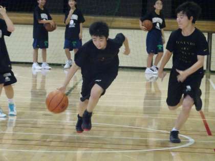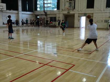 1対1やボール運びの練習をしていました。1対1ではディフェンスはオフェンスを中に入れないように守りましょう。ボールを運ぶときはコートを広く使い、パスをつなぎましょう。(遠藤)