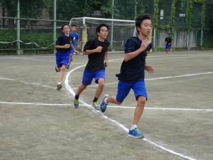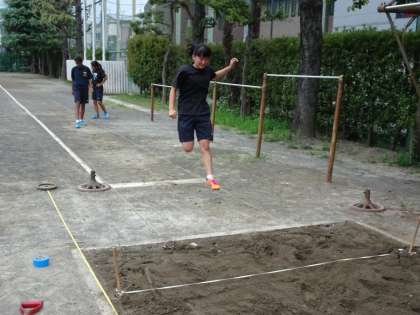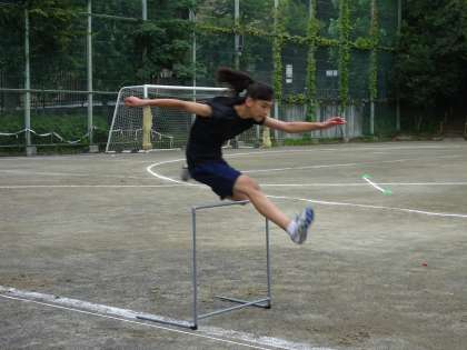 タイムを計りながら300mを走っています。ハードルや走り幅跳びの練習もしていました。(遠藤)