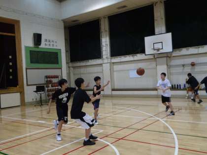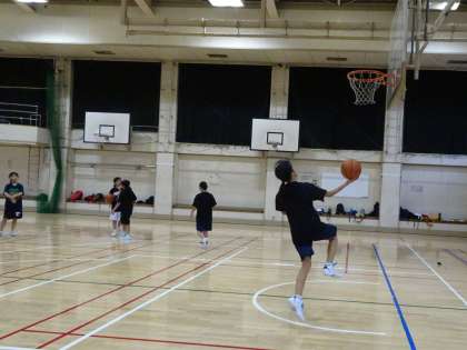 男子は2対2や3対3の対人練習をしていました。女子はレイアップシュートの練習です。どの距離で踏み切ればシュートが打ちやすいか、何回も練習して覚えましょう。(遠藤)