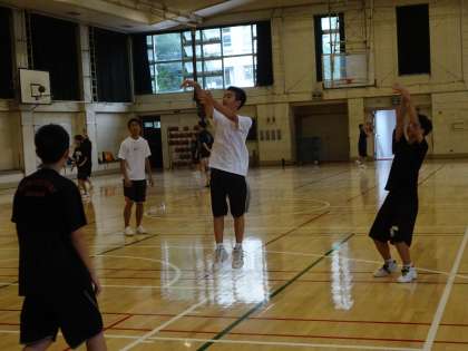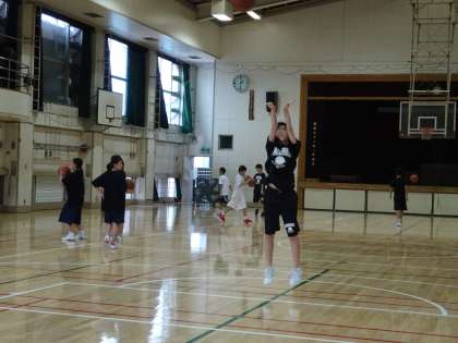 シュート練習をしています。ゴールまでこの距離、この角度なら必ず決めることができるという位置を見つけましょう。(遠藤)