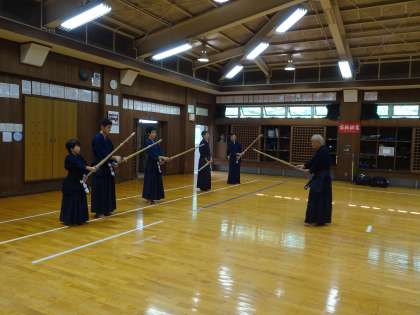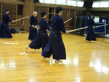 送り足の練習をしていました。剣道の動きを支えるのは足さばきです。きちんと身につけ、攻撃や守りで無駄のない動きができるようにしましょう。(遠藤)