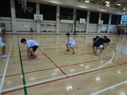 男子は下半身のトレーニングです。ひざを曲げ上体をおこし正面を向きましょう。女子は3対2の速攻の練習です。3回くらいのパスでシュートまでいけるようにしましょう。(遠藤)
