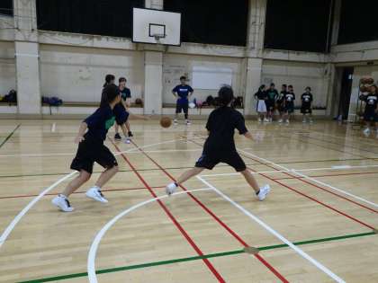 ボール運びの練習をしています。バスケットボールではボールを持ったときの動きよりも、ボールを持たないところでの動きの方が何倍も大切ですね。(遠藤)
