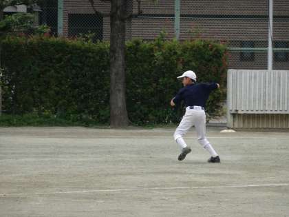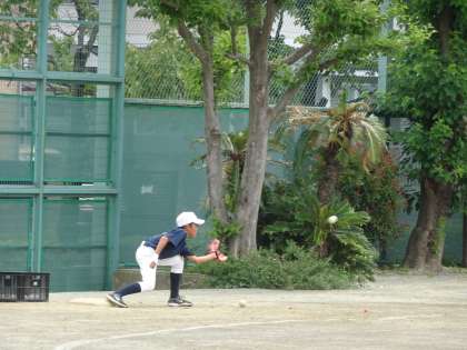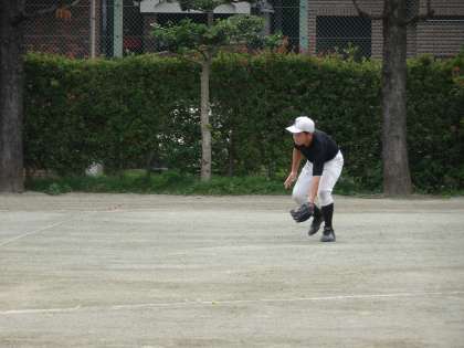内野のフィールディング練習です。ゴロは後ろに下がらず、前に出て正面で捕球しましょう。(遠藤)