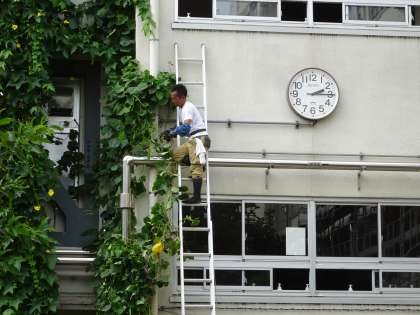 主事さんが中庭の植物の手入れをしてくれています。廊下のワックスがけや校内の清掃など、きれいな学校で生活できるのは主事さんのおかげです。感謝の気持ちををもって2学期の生活を送るようにしましょう。(遠藤)