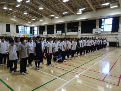 本日、全校朝礼を行いました。8:25までに整列し、朝礼を時間通りに始めることができました。