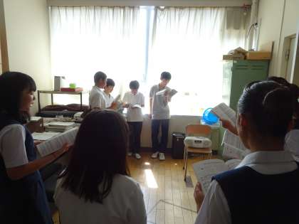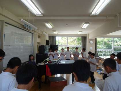 合唱コンクールに向けて「Let's search for Tomorrow」の練習をしていました。ソプラノの人数が少ないので、声の高い男子がボーイソプラノとしてソプラノパートに入っています。(遠藤)
