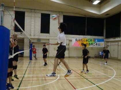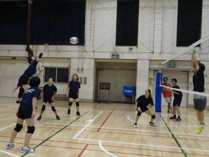 バドミントン部はシングルスとダブルスに分かれて練習しています。バレーボール部は男子対女子のゲーム形式の練習をしていました。(遠藤)