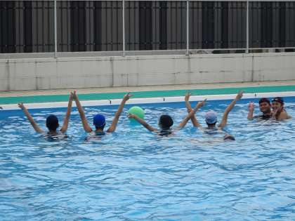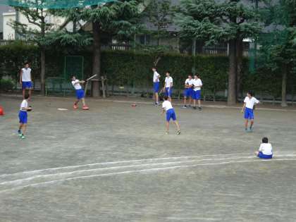 男子は校庭でソフトボールをしています。女子は水泳です。最後の自由時間ということでみんなで楽しんでいました。(遠藤)