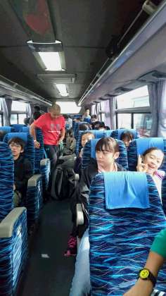 談合坂SAで休憩後、いよいよ富士山に向かいます。出発前のB組のバス内での様子です。(小林)