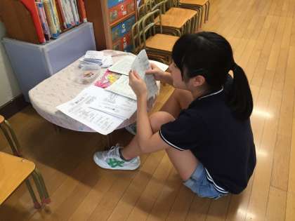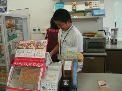 セブンイレブン弦巻一丁目店ではレジ打ちの体験をしています。上馬保育園では配布するお便りを折っていました。