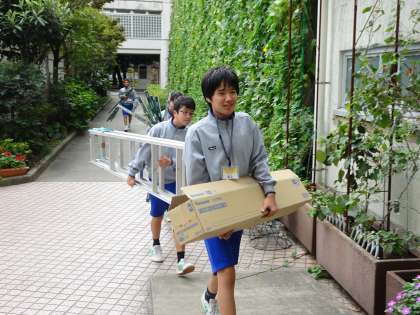 体験先が定休日等でお休みの生徒たちは学校の主事室で体験をしています。(遠藤)