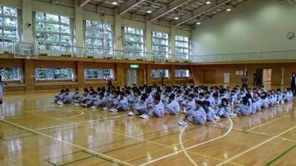 おはようございます。昨晩からの雨がまだあがらず、体育館での朝礼となりました。早朝にも関わらず、全員が5分前に集合できました。素晴らしい!天気を除いて、幸先良い1日の始まりです。(桝田)