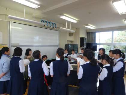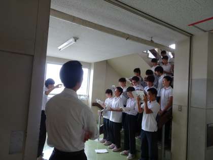 音楽の授業では男女に分かれての練習です。男子の練習を担任の先生が見守っていました。(遠藤)