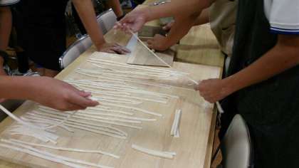 寝かせたうどんを延ばして、切って、しっかりとしたうどんの麺が完成しました。夕食が待ち遠しいですね。(桝田)