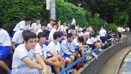 お弁当を食べ、午後の競技に備えます。日がさして暑くなってきました。(片桐)