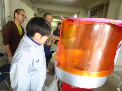 防災のブースでは初期消火訓練のお手伝いです。綿菓子を作ってる生徒もいます。どのブースでもみんなよく働いていますね。午後もがんばりましょう。(遠藤)