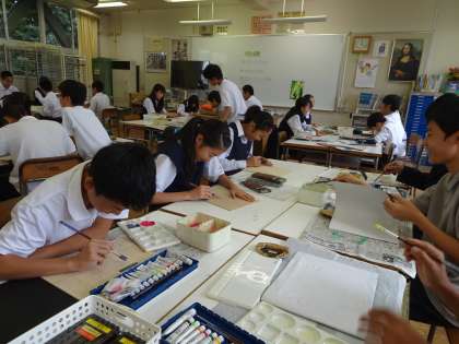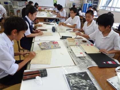 木版画の制作をしています。もう色付けに入っている人もいますね。完成が楽しみです。(遠藤)