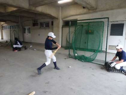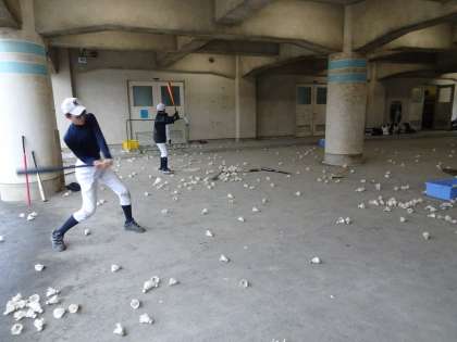プール下が雨天練習場になっています。トスバッティングやバドミントンのシャトルを打つ練習をしていました。自分のミートポイントまできちんとひきつけて打つことを意識しましょう。(遠藤)