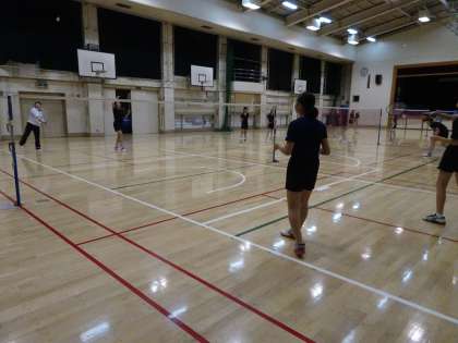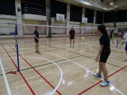 基礎打ちの練習です。顧問の松本先生も一緒にシャトルを打っていますね。(遠藤)