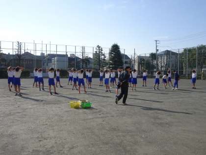 男子は校庭でソフトボールです。準備体操をきちんとしましょう。