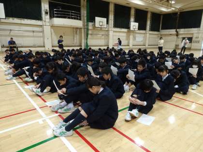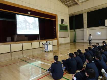 体育館で校外学習についてのガイダンスの後、大きなスクリーンで過去のCMを鑑賞し、CMのイメージを膨らませていました。みんなが行きたくなるようなCMを作成しましょう。(遠藤)