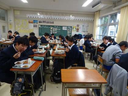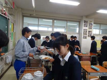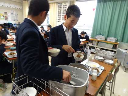 給食の様子です。4時間目が終わると、すぐに配膳の準備をしていました。おかわりもしていますね。残さずたくさん食べましょう。(遠藤)