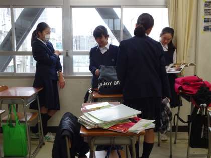 期末考査の朝、教室では早めに登校した生徒たちがまとめたノートを確認したり、問題を出し合ったりしてテストに向けて勉強していました。みんなでいい点を取れるようにがんばりましょう。(遠藤)