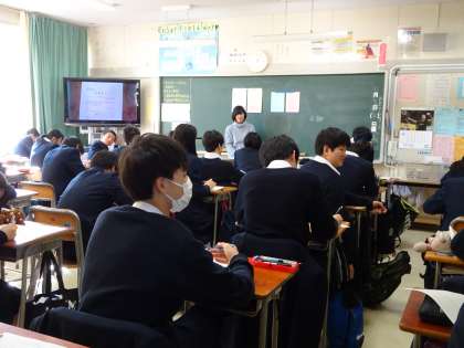 3年生は教科「日本語」の時間に、調査書を入れる封筒の書き方や推薦願の書き方を説明していました。(遠藤)