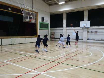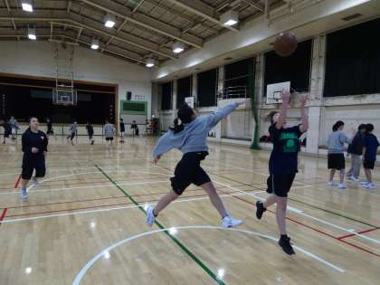 男子は3対3、女子は2対1をやっています。ディフェンスのプレッシャーがまだまだ弱いので、もっとプレッシャーをかけてディフェンスをしましょう。(遠藤)