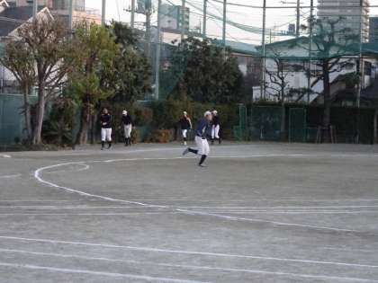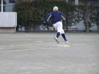 ベースランニングの練習をしています。ベースを回るときは内側に重心をかけ、大回りにならないようにしましょう。(遠藤)