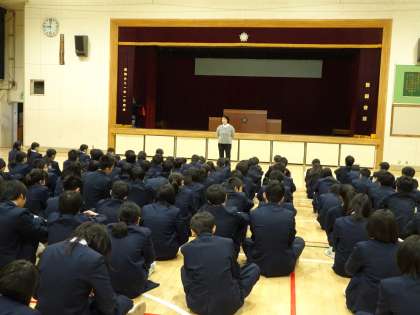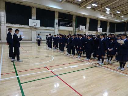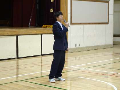 学級委員と生活給食委員から組織される1mm前進プロジェクトのメンバーが整列や司会進行をしています。各クラスの学級委員からから2学期の反省が伝えられました。また、プロジェクトリーダーから2学期の取り組みとその成果について話がありました。(遠藤)