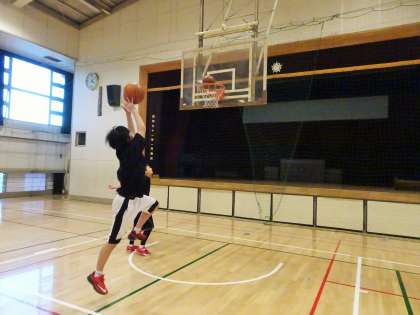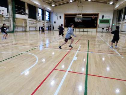 男子はリバウンドの練習です。できるだけ高い位置でボールをキャッチしましょう。女子は3対2をやっています。アウトナンバーでのディフェンスの仕方を覚えましょう。(遠藤)