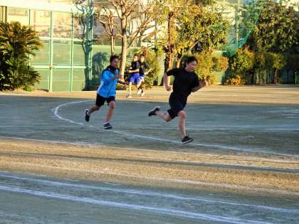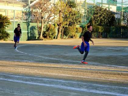 トラックを40秒間走り続ける練習をしていました。自分の限界の一歩先をめざしましょう。(遠藤)