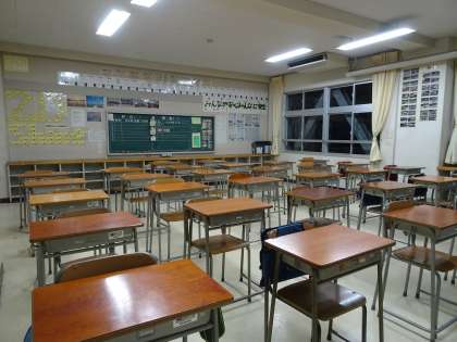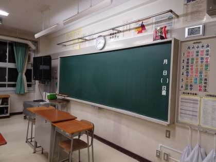 体育館や教室はきれいに整理整頓され、黒板も新学期の授業が気持ちよく始められるよう新品同様にきれいになっています。