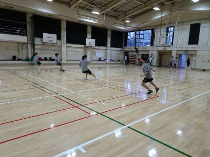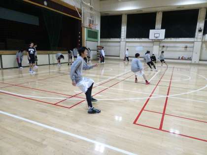 フットワークをやっています。足の運び、上半身の使い方等、オフェンスもディフェンスもフットワークが基本です。腰を落として低い姿勢で行いましょう。(遠藤)