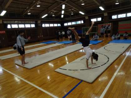 男子は体育館でドッヂボールをしていました。女子は格技室でマット運動をしています。(遠藤)