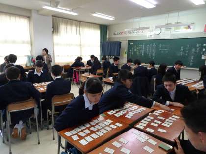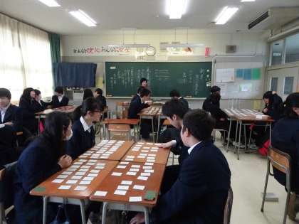 百人一首の練習をしていました。たくさん札を取れるように作戦を考えましょう。(遠藤)