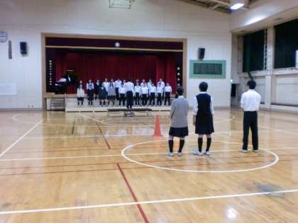来週末の23日(土)に合唱コンクールをひかえて、各学級とも練習に熱が入ってきました。校内には、歌声が響いています。写真は3年A組の舞台練習を、練習を終えた2年C組が見学しているところです。上級生の熱く練習に打ち込む姿は、すばらしい手本となり、伝統を作っていきます。三年生の合唱はすでに感動的になりはじめています。パートリーダーが前に出て、音を確かめてそれぞれのパートの手直しをしていますので、今後の上達が楽しみです。