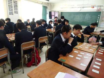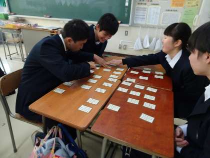 百人一首の練習をしています。1つでも多く覚えて、明日の百人一首大会で優勝できるようにがんばりましょう。(遠藤)