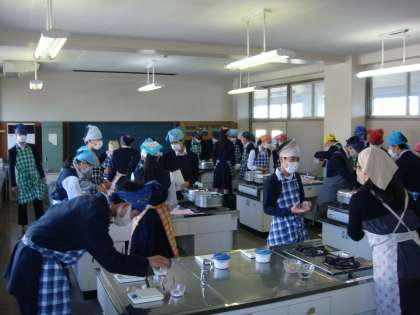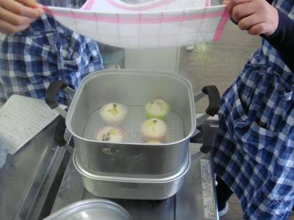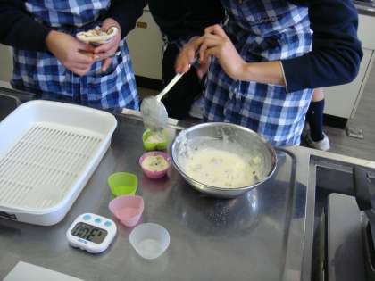 今日は調理実習で蒸しパンを作っています。さつまいもやチョコレートが入った蒸しパンです。おいしそうに蒸し上がっていますね。(遠藤)