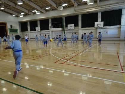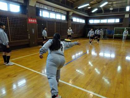 校庭が雪のために使用できないので、男子は体育館でドッジボールをしています。女子は格技室でドッジビーをしていました。(遠藤)