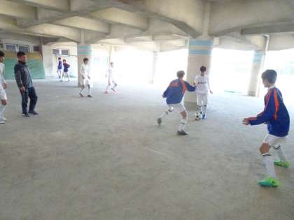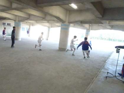 サッカー部が活動中です。校庭が雪のため、まだ使用できないのでプール下で練習しています。(遠藤)