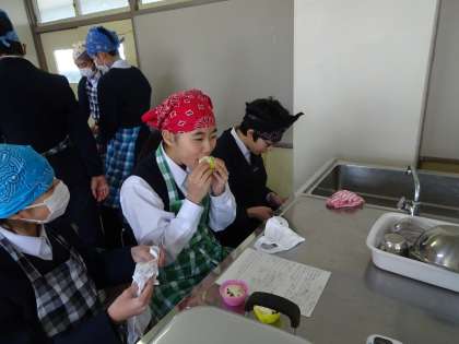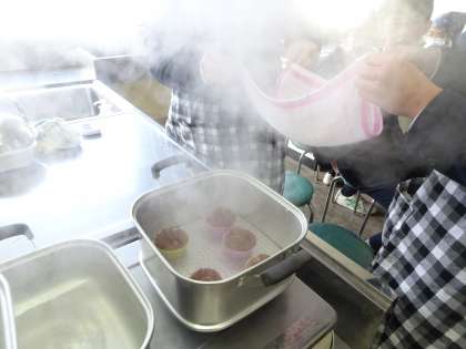 調理実習で蒸しパンを作っていました。きれいに蒸し上がりましたね。味の方はどうでしょうか?(遠藤)